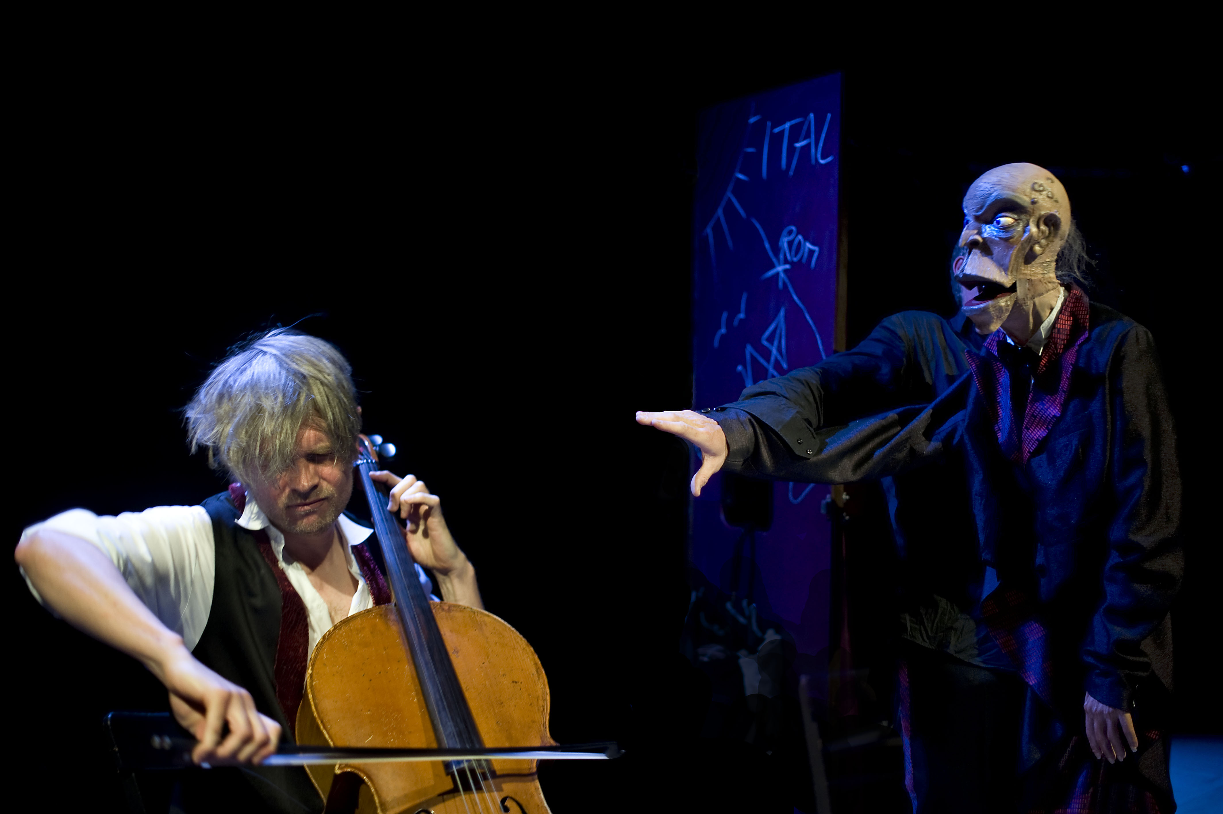 An seiner Seite sein musikalischer Abendpartner Gero John am Violoncello. Hier hörte man einen Profi, der tatsächlich in allen Stilen zu Hause ist, wenn man sich auch wünschen würde ihn einmal mit Trois strophes sur le nom de Paul Sacher von Henri Dutilleux zu hören. Wünschen, dass darf man… Ganz nebenbei übrigens hat John auch noch in einigen Rollen des Abends mitgetan, aber das nur am Rande.